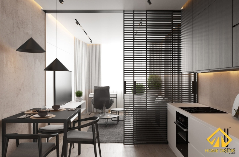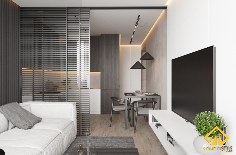 Giữa hai không gian phòng khách và khu vực bếp nấu nướng sẽ được chúng tôi phân chia và ngăn cách chỉ bằng tấm vách ngăn kéo với kẻ ô ngang. Vừa tạo được ranh giới giữa hai phòng mà cũng tạo nên nét đẹp hiện đại trong đó nữa.