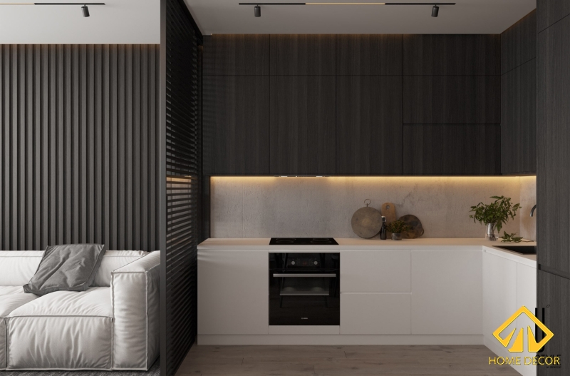 Bộ dàn tủ bếp mà Home Decor chúng tôi lựa chọn dành cho bản thiết kế mô phỏng căn chung cư chị Ngọc này là dáng tủ cao áp sát trần. Không những vậy mà điểm nổi bật, cuốn hút được người nhìn chính là sự tách biệt hai tone màu nâu đen gỗ và tủ bàn dưới trắng sáng.