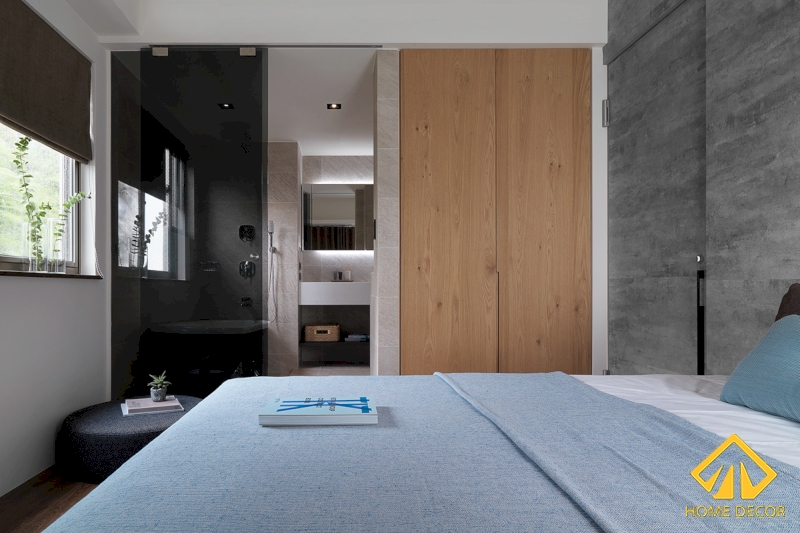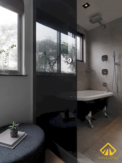 Khu vực vệ sinh trong phòng ngủ này được Home Decor thiết kế chỉ bằng lớp kính đen trong để ngăn cách.