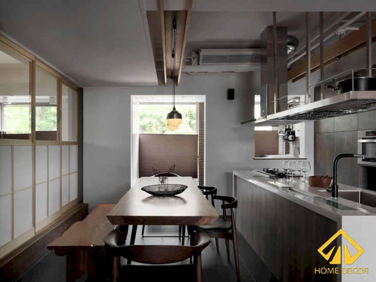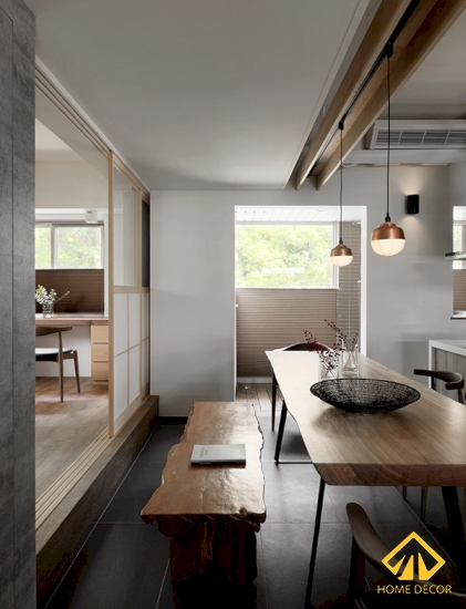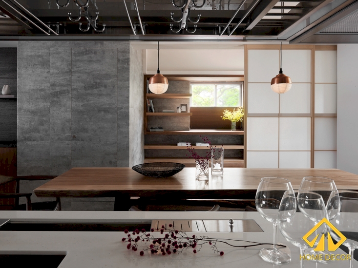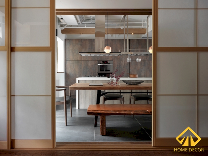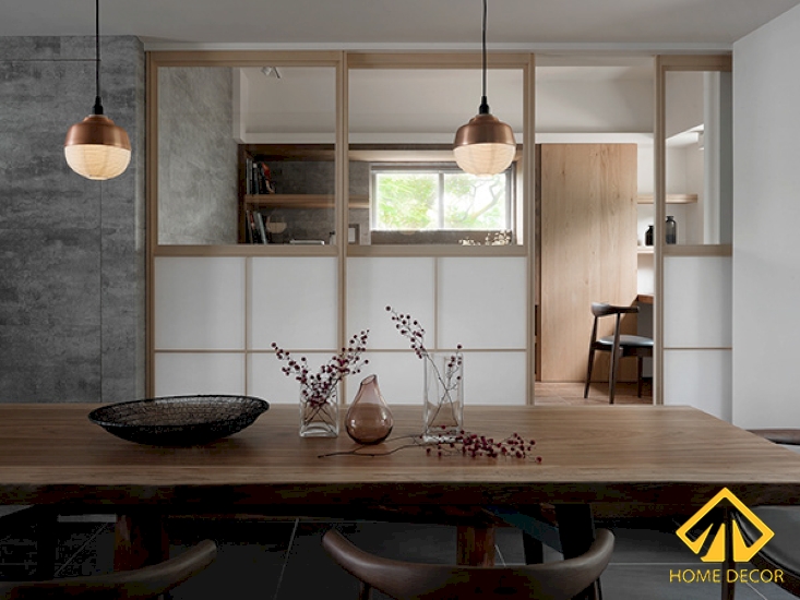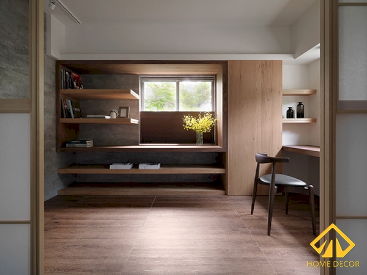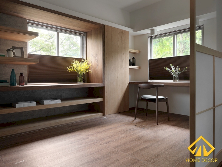 Bên dưới khu vực phòng bếp nẫu nướng chính là căn phòng làm việc theo phong cách Nhật Bản rất ấn tượng. Bắt đầu bước vào căn phòng chúng ta có thể thấy ngay khung cửa kéo bằng gỗ nâu sáng cùng lớp dán kính mờ theo dáng của Nhật.