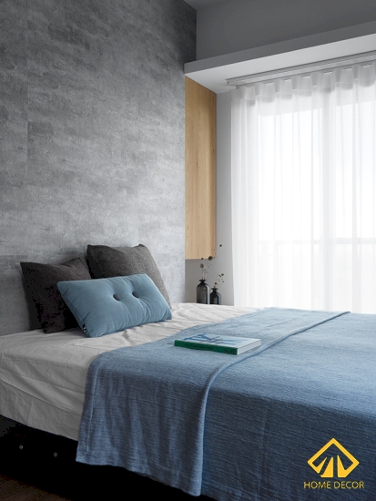 Chúng ta tiếp tục bước đến căn phòng ngủ với thiết kế không gian đơn giản bằng tone màu xám và nâu gỗ ấm cùng để làm nổi bật lên đồ nội thất khác. Có thể thấy rõ nhất chính là chiếc giường ngủ đơn giản được đặt sát với tường nhưng vẫn toát lên được nét đẹp hiện đại.