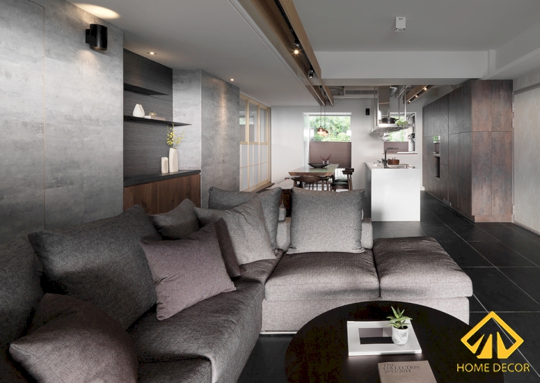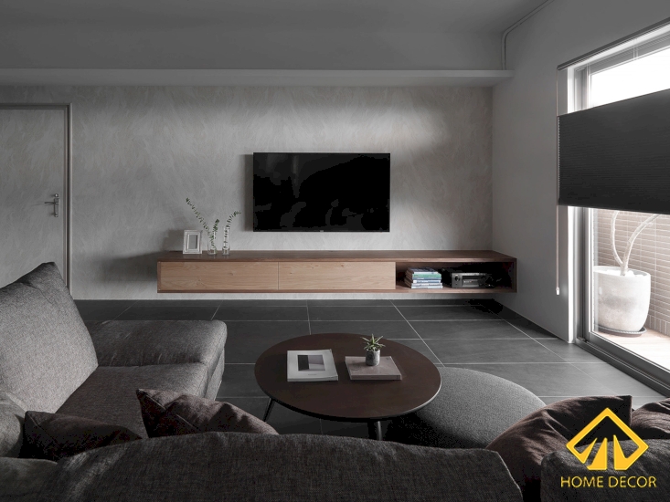 Trong căn phòng khách của gia đình chị Hân thì Home Decor chúng tôi đã lựa chọn sử dụng nền sàn bằng gạch vuông màu đen xám, kết hợp chung với tường xám trắng nhám vô cùng hài hòa và dễ dàng làm nổi bật đồ gỗ nội thất trong phòng lên.
