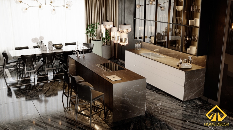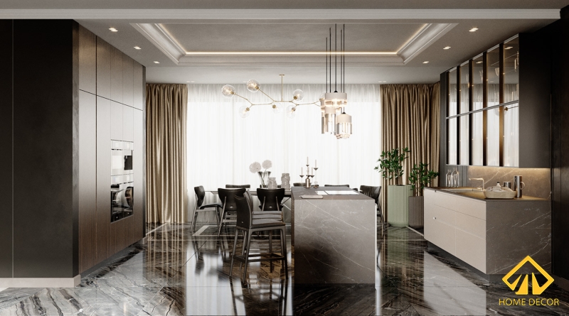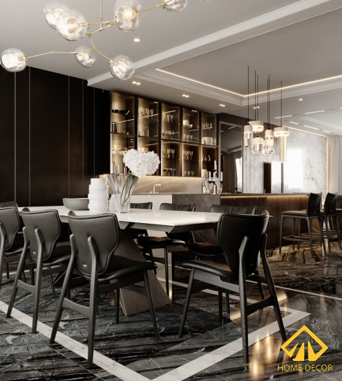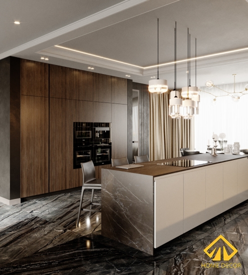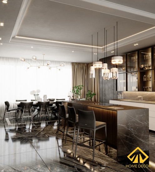 Bộ tủ dàn bếp trong căn chung cư này chúng tôi - Home Decor đã có sự sáng tạo đột phá bởi thay vì những cánh cửa kéo bằng gỗ thì đó sẽ là các tấm kính chịu lực trong vắt. Vừa tạo nên được tính sang trọng, tao nhã mà cũng giúp gia chủ dễ dàng bày biện đồ dùng gia đình ở trên đấy. Ngoài ra vì mong muốn mọi người trong nhà sẽ có thêm nhiều chỗ cất chứa đồ nên Home Decor đã đặt ngay đối diện bàn bếp là tủ gỗ cao áp sát trần và bao gồm đầy đủ tiện nghi thiết bị như lò nướng, tủ lạnh,.. Chiếc bàn bar bên trên được đặt kèm thêm bộ bếp điện từ giúp vừa tiết kiệm được không gian mà cũng cảm thấy thoải mái khi vào bếp nấu nướng.
