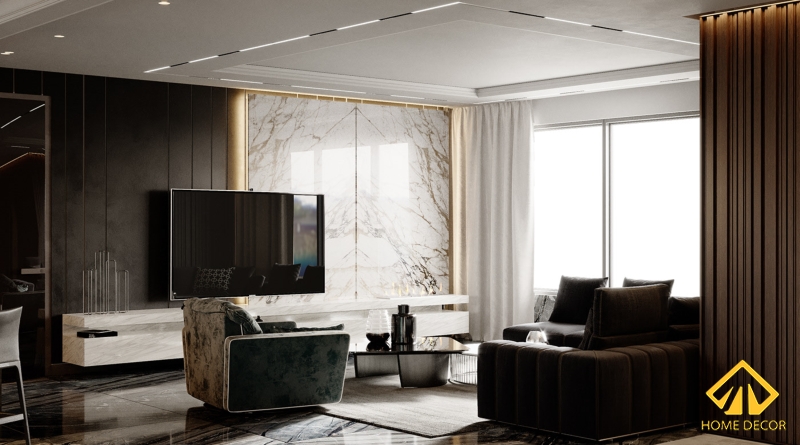 Căn phòng khách tại chung cư cao cấp của chị Nhung, tại đây đội ngũ thiết kế đưa ra những ý tưởng về bức tường đa dạng chất liệu, màu sắc nhưng sẽ duy nhất dùng sàn nhà đá ốp cẩm thạch sang trọng màu đen xám. Chiếc cửa sổ luôn là điều không thể thiếu trong căn nhà, bởi nhờ có chúng mà mọi điều tốt lành như bầu không khí thoáng mát, nguồn ánh sáng tự nhiên sẽ tràn ngập tại căn nhà. Không những vậy, đôi khi nhờ có chúng mà chúng ta mới có được nguồn cảm hứng tích cực trong ngày mới.