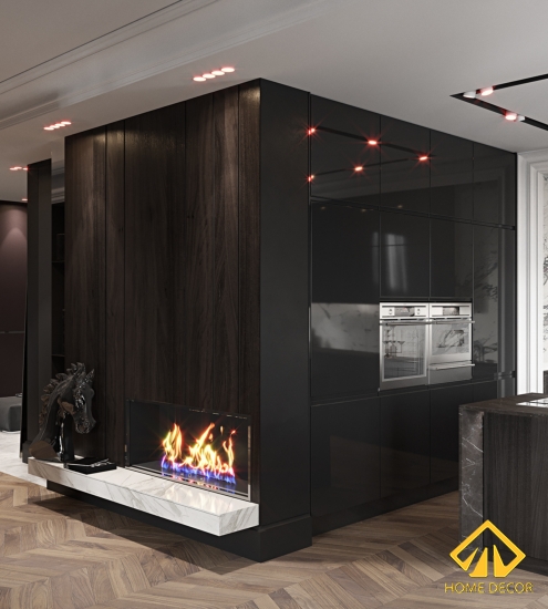 Bộ dàn tủ bếp được đội ngũ thiết kế chúng tôi mang đến cảm giác hoàn toàn mới mẻ với dáng tủ cao chạm trần, toàn bộ đồ gỗ nội thất ở đây đều được sử dụng bằng chất liệu màu đen giúp hài hòa chung với tất cả đồ vật dụng khác. Ngoài ra để làm nổi bật lên được các đồ màu đen, màu trầm đó thì Home Decor đã tận dụng ngay những tấm vách gạch vân cẩm thạch màu trắng để làm tôn lên nét đẹp vốn có của chúng.