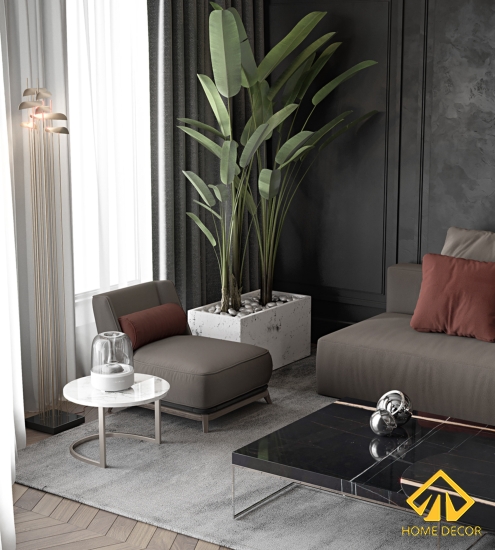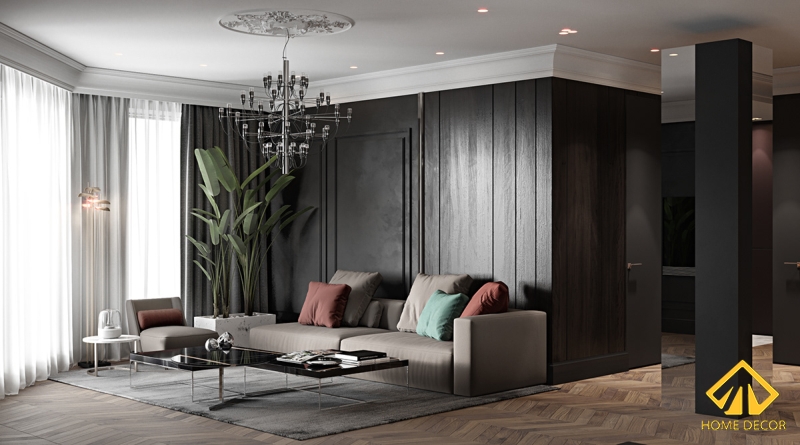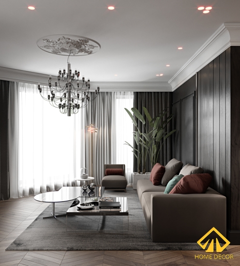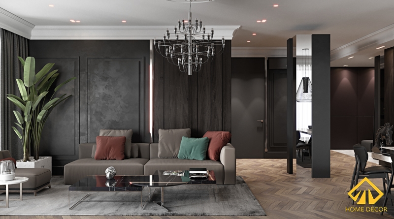Đáp ứng đúng yêu cầu của anh Tiến, đội ngũ thiết kế nội thất chung cư của Home Decor chúng tôi đã đưa ra những bản vẽ mô phỏng vô cùng đa dạng và độc đáo với tone màu chủ đạo của không gian phòng khách này chính là màu xám. Đây là màu sắc trầm, an toàn và song song là luôn mang lại cảm giác sạch sẽ. Bức tường họa tiết pháo chỉ của căn phòng khách này được Home Decor thiết kế và lựa chọn với lớp sơn phủ màu xám đen. Nhằm tạo nên cảm giác sang trọng mà vẫn tối giản được màu sắc. Còn đối với nền nhà, chúng tôi mang đến cho anh Tiến sắc nâu của chất liệu gỗ tự nhiên giúp cho chúng ta khi nhìn tổng thể cả căn phòng sẽ không bị quá nhàm mắt và nhạt nhòa.
