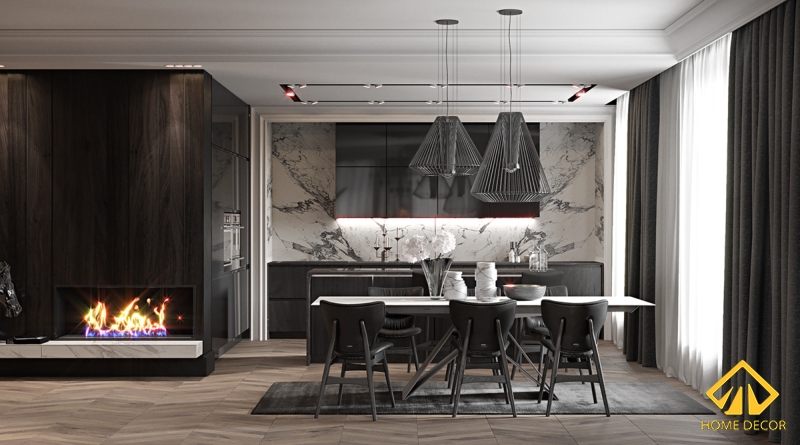 Và chắc chắn, chúng ta sẽ không thể bỏ qua được bộ bàn ăn đúng không! Tại đây, Home Decor chủ yếu sử dụng bằng chất liệu gỗ làm chân đứng và bề mặt là tấm đá màu trắng nổi bật hoàn toàn trên nền nhà gỗ nâu.