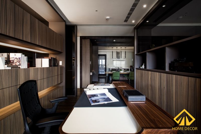 Đằng sau chiếc kệ tủ tivi khung tấm cao này thì Home Decor đã tận dụng là phòng làm việc không gian mở liên kề với phòng khách. Từ phía bên phòng khách đi sang khu làm việc có thể bước qua một tấm vách cửa kính thiết kế kéo ngang.