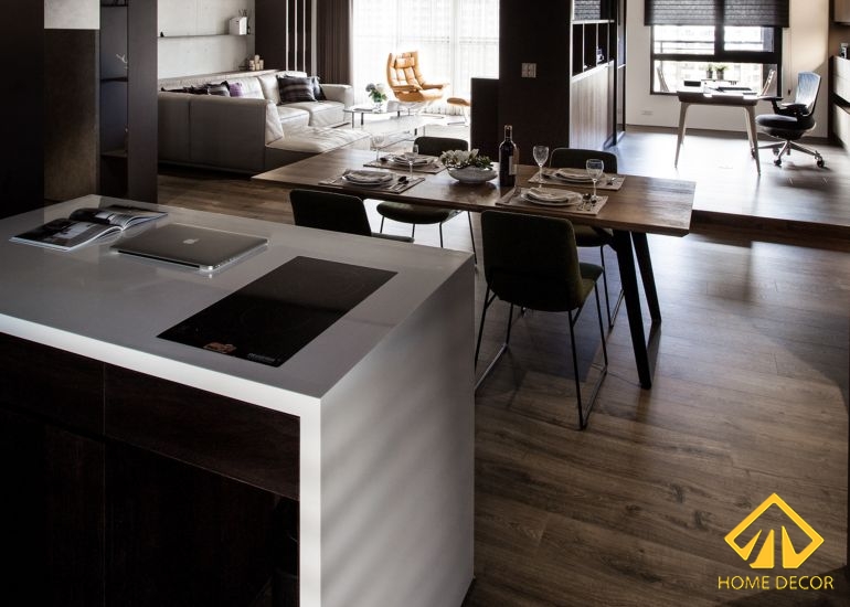 Phía bên trái là khu vực phòng bếp nấu ăn, thì ở ngay phía bên trái sẽ là không gian phòng khách liền khu làm việc. Tại không gian này, Home Decor đã chia đôi ra làm hai khu vực khác nhau vừa để có thêm phòng vừa tiết kiệm được diện tích.
