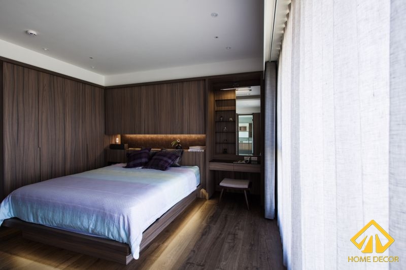Chiếc gường được thiết kế màu nâu sẫm làm nổi bật hoàn toàn mọi nội thất khác trong phòng ngủ. Ngay sát giường ngủ đó là chiếc tủ quần áo dáng đứng cao đến trần. Chiếc tủ quần áo này được thiết kế với dáng đứng cánh tủ cao hơn giường và dưới cũng có thêm ngăn kéo mở nữa. Vừa tiện lợi sử dụng mà còn tiết kiệm được diện tích căn phòng ngủ.