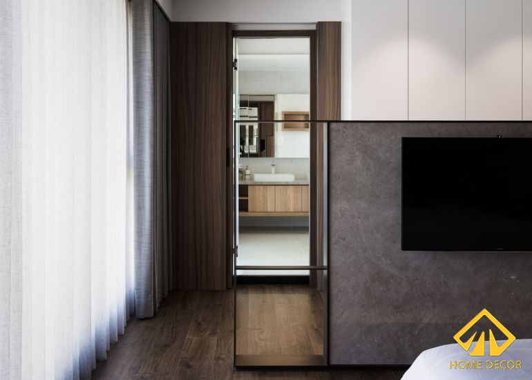 Căn phòng ngủ của vợ chồng anh Tuấn có diện tích phòng lớn cùng với chiếc giường ngủ full size. Trên đầu sẽ là một tủ gỗ lớn vừa chứa đựng đồ dùng mà đồng thời cũng bao gồm cả bàn phấn trang điểm. Phòng có thiết kế tấm cửa kính to rộng giúp căn phòng thêm sang trọng. Căn phòng được thiết kế với hai không gian nơi ngủ và khu vực tủ quần áo. Hai không gian ấy được ngăn cách bởi tấm vách kệ tivi bằng vách vân đá màu xám.