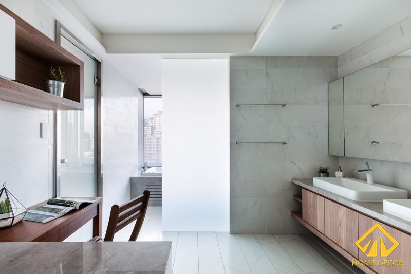 Phòng vệ sinh mà Home Decor thiết kế với không gian mở, sử dụng nhiều chất liệu vân đá trắng cùng đồ nội thất gỗ nâu vân. Khu vực bồn tắm sẽ nằm ngay bên cạnh tấm kính cửa sổ với chiếc rèm kéo hiện đại Buổi tối sẽ mang đến một không gian lãng mạn với các ánh đèn nến lung linh.