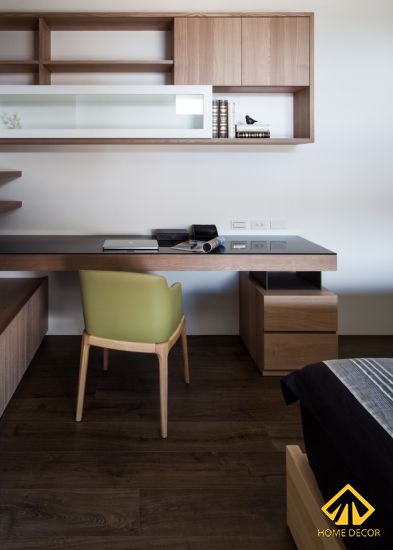Nơi làm việc này sẽ được nâng cao thêm tầm 10cm giúp tách biệt hoàn toàn với tổng thể không gian nhà và đồng thời cũng đang tạo cảm giác cho gia chủ sự tâm trung tuyệt đối khi làm việc.