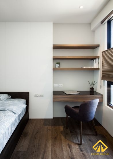 Và cuối cùng là căn phòng ngủ thứ 3, cũng giống như các căn phòng trước là luôn được hưởng ánh nắng mặt trời vào trong phòng ngủ. Ngay bên cạnh tấm cửa kính đó là chiếc bàn học, bàn làm việc áp sát tường vừa tiết kiệm được không gian mà còn đẹp về cho cả phòng.