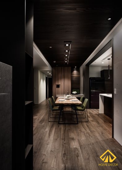 Bước từ ngoài vào ta đã thấy khu vực bàn ăn được thiết kế sắp xếp trước mặt. Mẫu bàn ăn cũng được sử dụng bằng chất liệu gỗ nâu cùng chân bàn thiết kế khung mỏng màu đen. Ngay phía bên phải sẽ là không gian phòng bếp nấu ăn.
