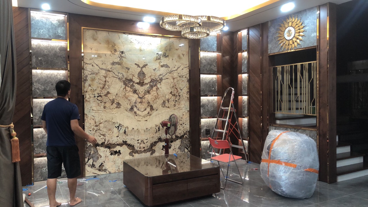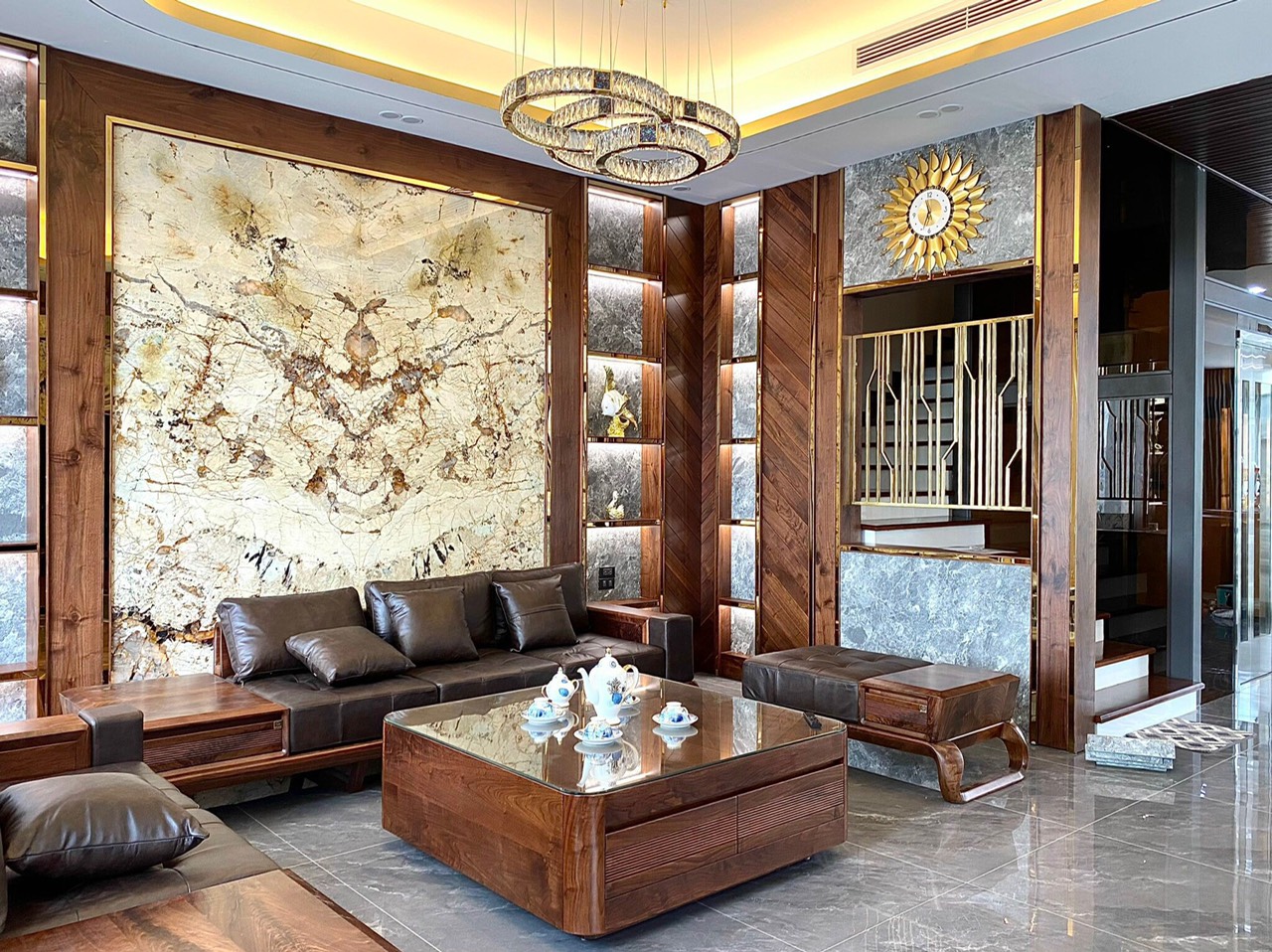 phòng khách nổi bật với không gian hiện đại với bộ sofa chân xoắn diện tường vách được trang trí bằng tranh đá nguyên bức đẳng cấp đi kèm theo đó điểm nổi bật được nhấn theo là đường chỉ nẹp inox mạ vàng vô cùng tinh xảo khiến phòng khách trở lên đẳng cấp hơn bao giờ hết.